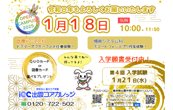 進路で迷っておられる方、進学をご検討中の方、この機会に出雲コアカレッジを体験してみてください。