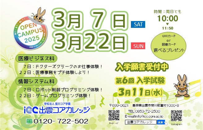 進路で迷っておられる方、進学をご検討中の方、この機会に出雲コアカレッジを体験してみてください。