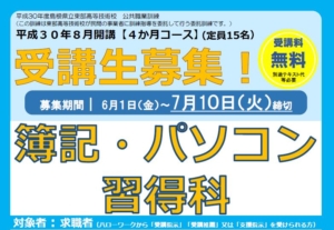 この訓練は、日商簿記やパソコン(ワード・エクセル)、ジョブパス等の資格取得を目指し、各種オフィスアプリケーションを活用した書類作成や、簿記会計電話応対などの事務業務ができる人材を育成します。受講料は無料です。(テキスト代が必要です)最寄りのハローワークの窓口でご相談のうえ、入校願に必要事項を記入して、住所地を管轄するハローワークに提出してください。
