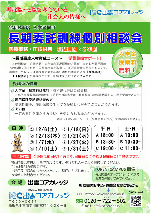 本校では、求職活動中の方などを対象とした、長期(2年間)の職業訓練を行っています。つきましては、下記のチラシのとおり個別相談会を開催します。まずは、お気軽にご参加ください。